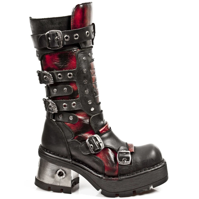 Cette déclinaison de cuir noir et rouge est superbe, les nombreux rivets, les boucles en forme de skull, les larges talons tout métal sont dans la grande lignée du style gothique