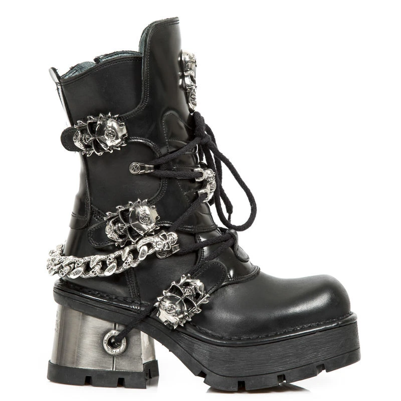 Vous voulez du goth pur et dur ? Alors que pensez-vous de ce modèle ? Boucles en forme de têtes de mort, larges talons métalliques, semelles compensées, gros skull frontal, chaîne de décoration à gros maillons: la totale pour cette paire de New rock M.1074-C1