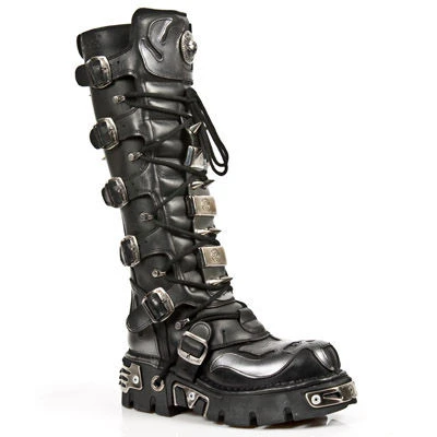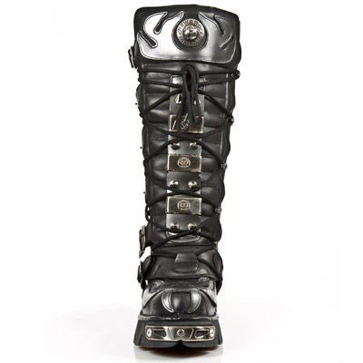 Un modèle de fou ! Cette paire de grandes bottes en cuir noir est agrémentée de clous pointus à l’avant ainsi qu’à l’arrière, comme si cela ne suffisait pas, new rock a en plus ajouté un gros patch en cuir gris sur l’avant de la botte , le résultat est démentiel, un botte sans concessions dans le pur style dark goth métal pour les amateurs d’extrême