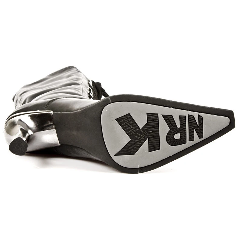 Grandes bottes en cuir lisse noir avec laçage sur l’avant et fermeture éclair sur le bas pour facilité l’enfilage, simples et élégantes à la fois, en toutes circonstances elles seront sublimées votre tenue avec son talon original métallique de huit cm. Ce modéle de chez New-Rock est trés féminin avec son bout pointu et confortable car trés souple.