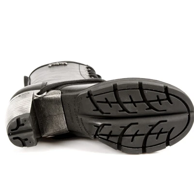 Ces bottes en cuir noir New rock sont dans le pur style gothique, un talon métallique original de 8 cm, tige de 14 cm, semelles de 2 cm, grand laçage frontal pour un résultat sobre et classe