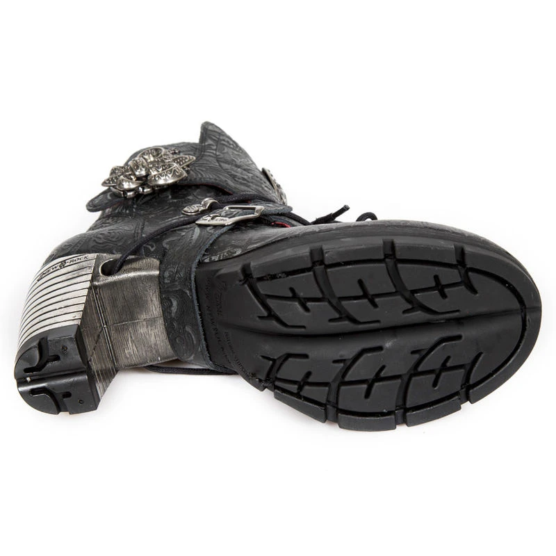 Esprit gothique royaliste pour cette paire de bottines en cuir noir gravé de motifs baroques gris