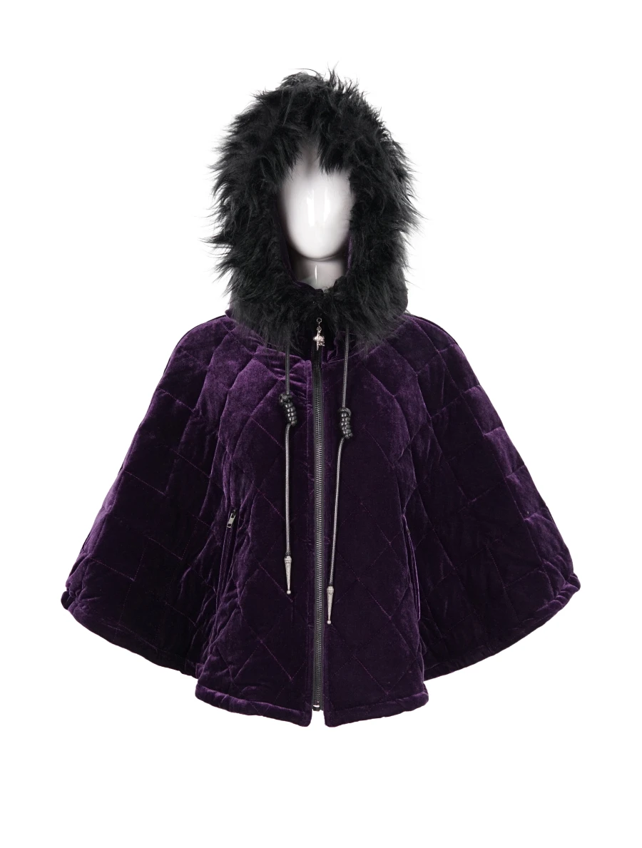 Grande capuche pointue, esprit sorcière, bordée de fourrure synthétique