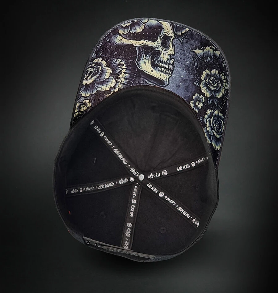 Sérigraphie sous la visière avec le design moon light représentant un skull entouré de fleurs