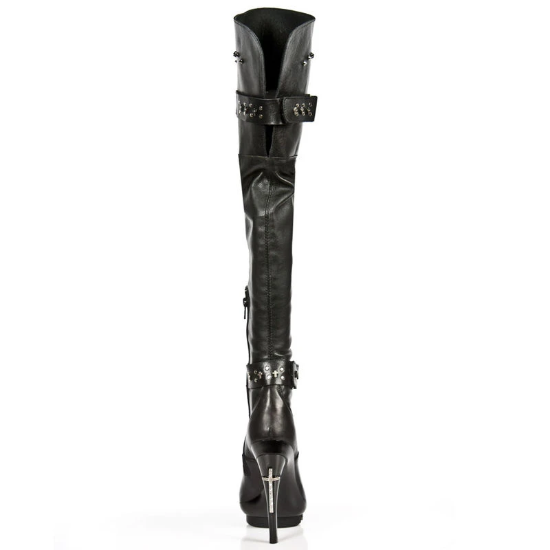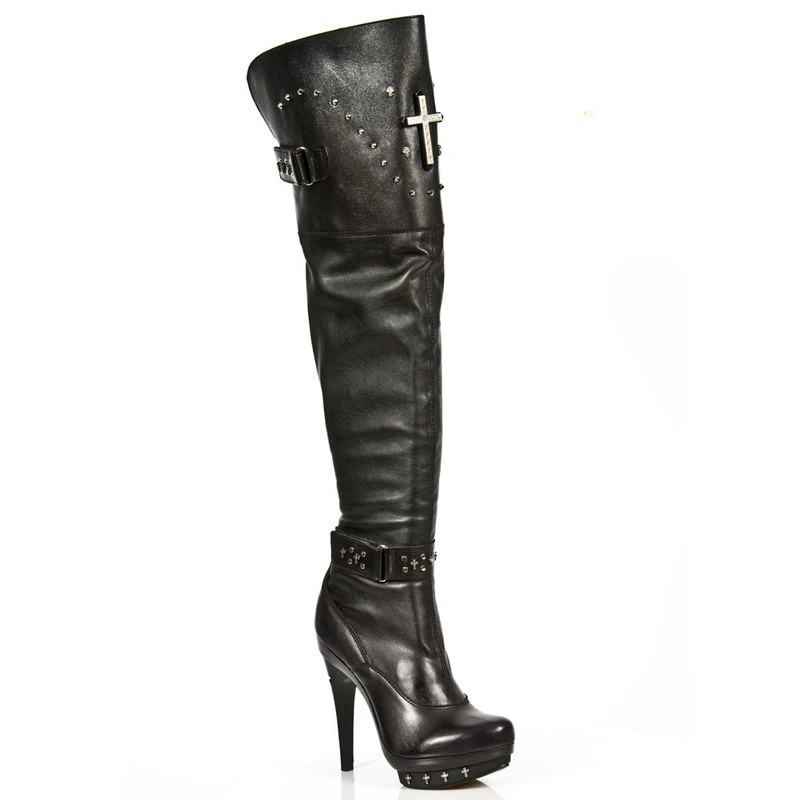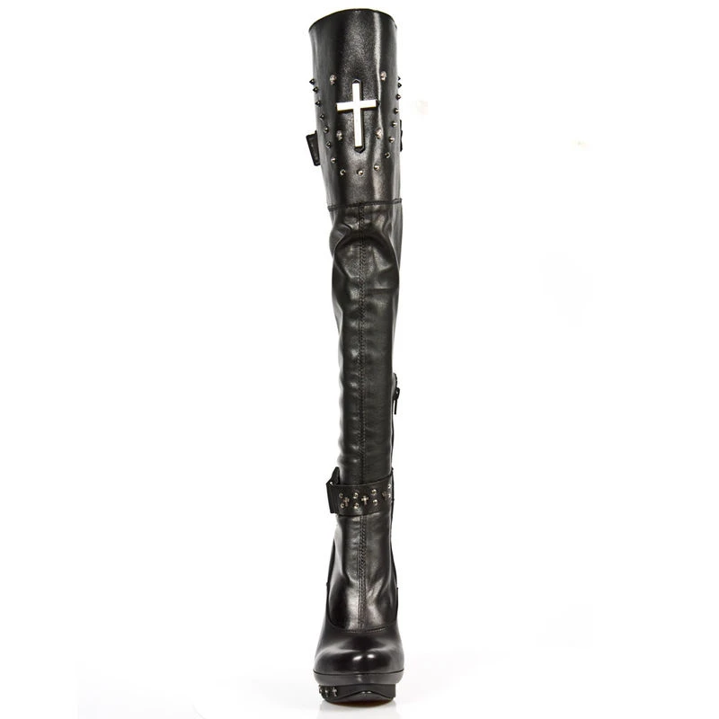 All black pour ce modèle de cuissardes cuir de chez New Rock, le cuir, les semelles, les talons, seuls les clous et la croix gothique ne le sont pas et du coup ils contarstent à merveilles avec les bottes