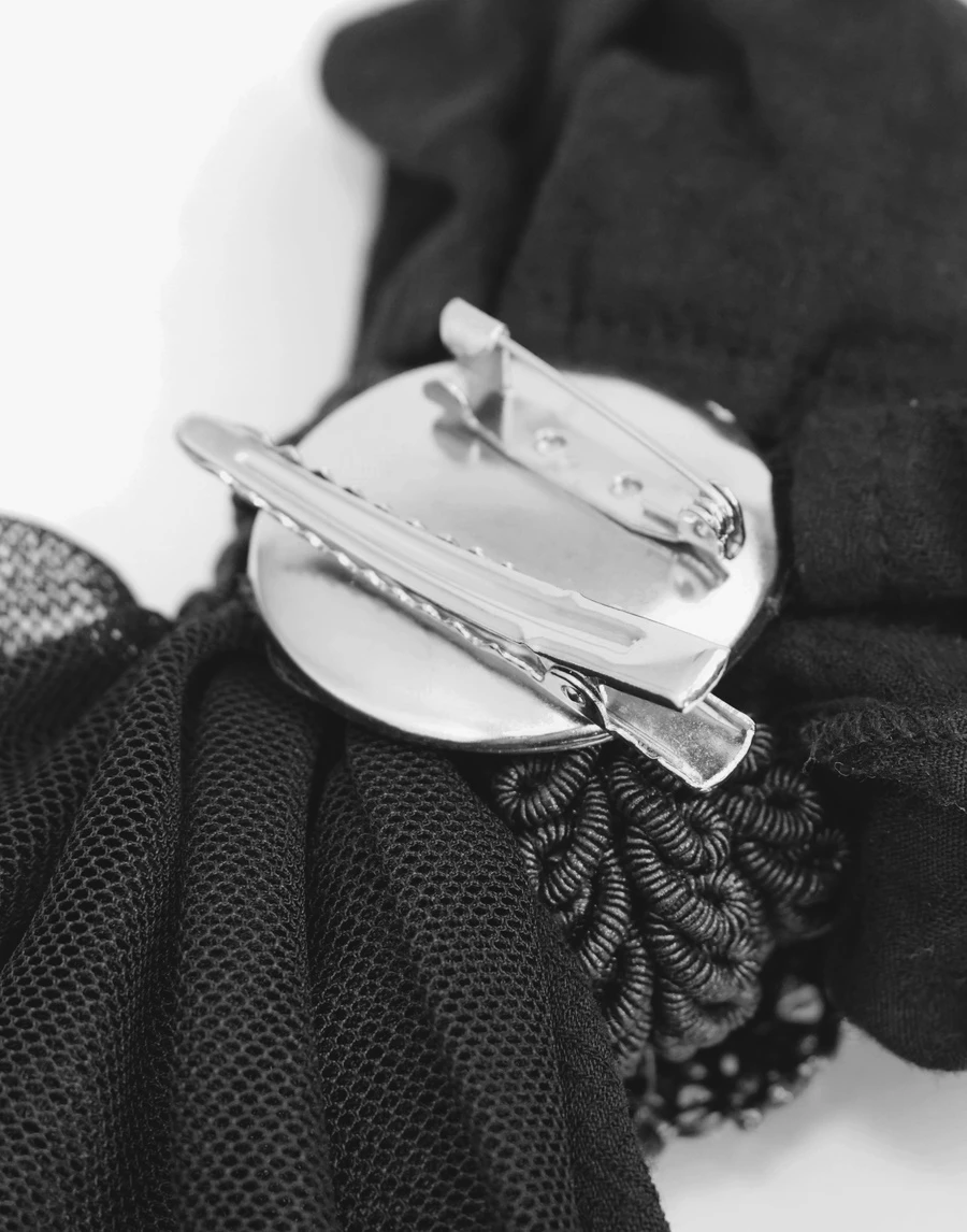 Le jabot se fixe très facilement grâce à sa pince crocodile et également son épingle à nourrice