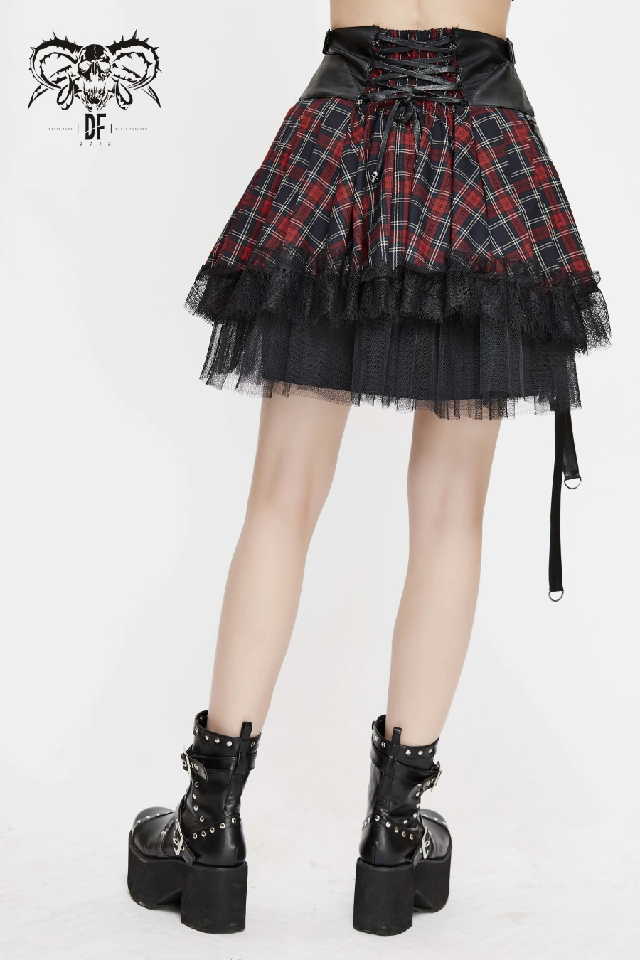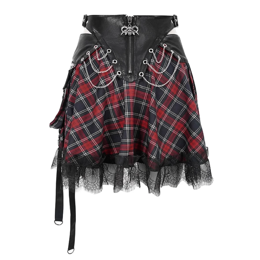 Très belle jupe plissée en tissu tartan et simili cuir noir