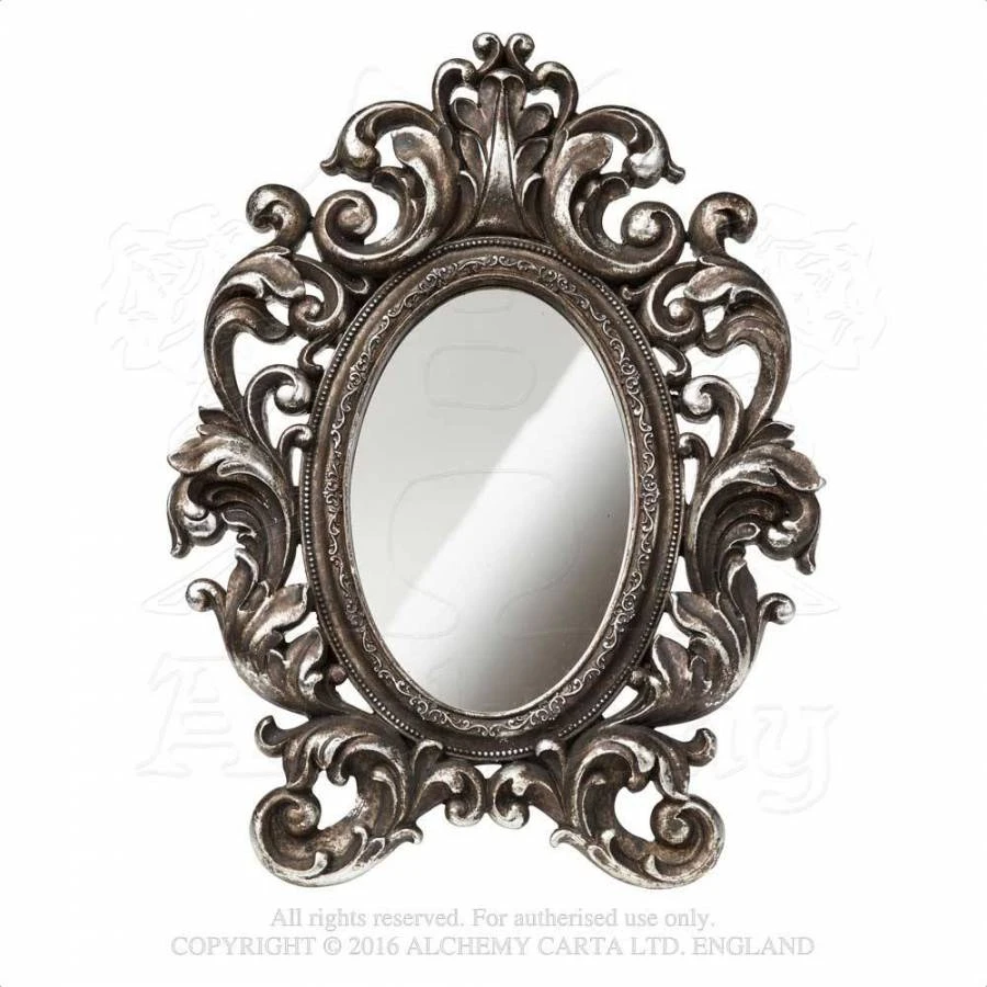 Splendide miroir de style victorien en résine argentée effet vieilli, il possède un petit trépied vous permettant de le poser sur un meuble, mais vous pouvez également le fixer au mûr grâce à son crochet tableau
