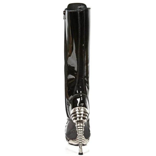 Superbes bottes hautes de la marque New Rock. Comme tous les modèles de la marque, ces bottes sont entièrement faites de cuir. L’aspect vernis de la botte ajoutera un style original et très féminin à votre tenue, et pourra ainsi se marier avec tout. Pour le côté plus rock, le talon en métal est un symbole de New Rock. Ciselé selon la forme d’une colonne vertébrale, ce talon apporte la touche finale à cette chaussure qui n’a rien de banal. Sa hauteur ne sera pas un problème et vous pourrez enfin marcher avec des talons en tout confort. Et si vous vous inquiétez de devoir faire et défaire les lacets tous les jours, ne vous en faites pas ! Une fermeture éclair très discrète est présente sur le flanc intérieur de la botte afin de vous faciliter la tâche !
