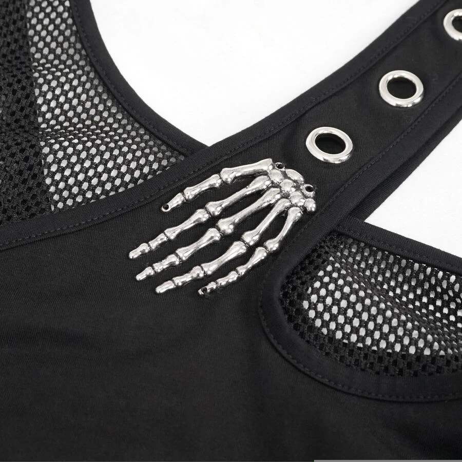 Double bretelles à gauche dont l’une est agrémentée de gros oeillets et d’une grande main de squelette en métal