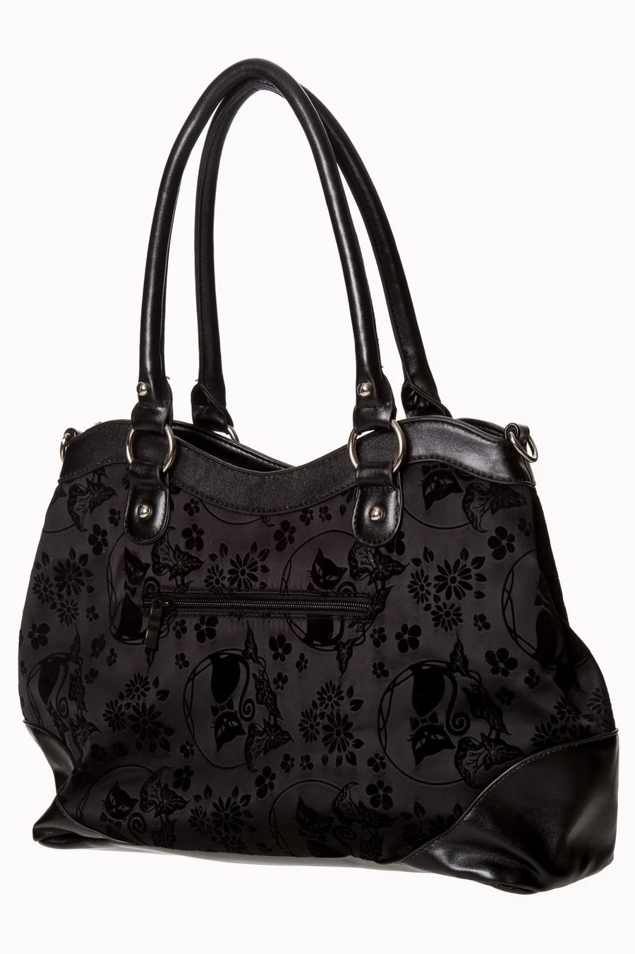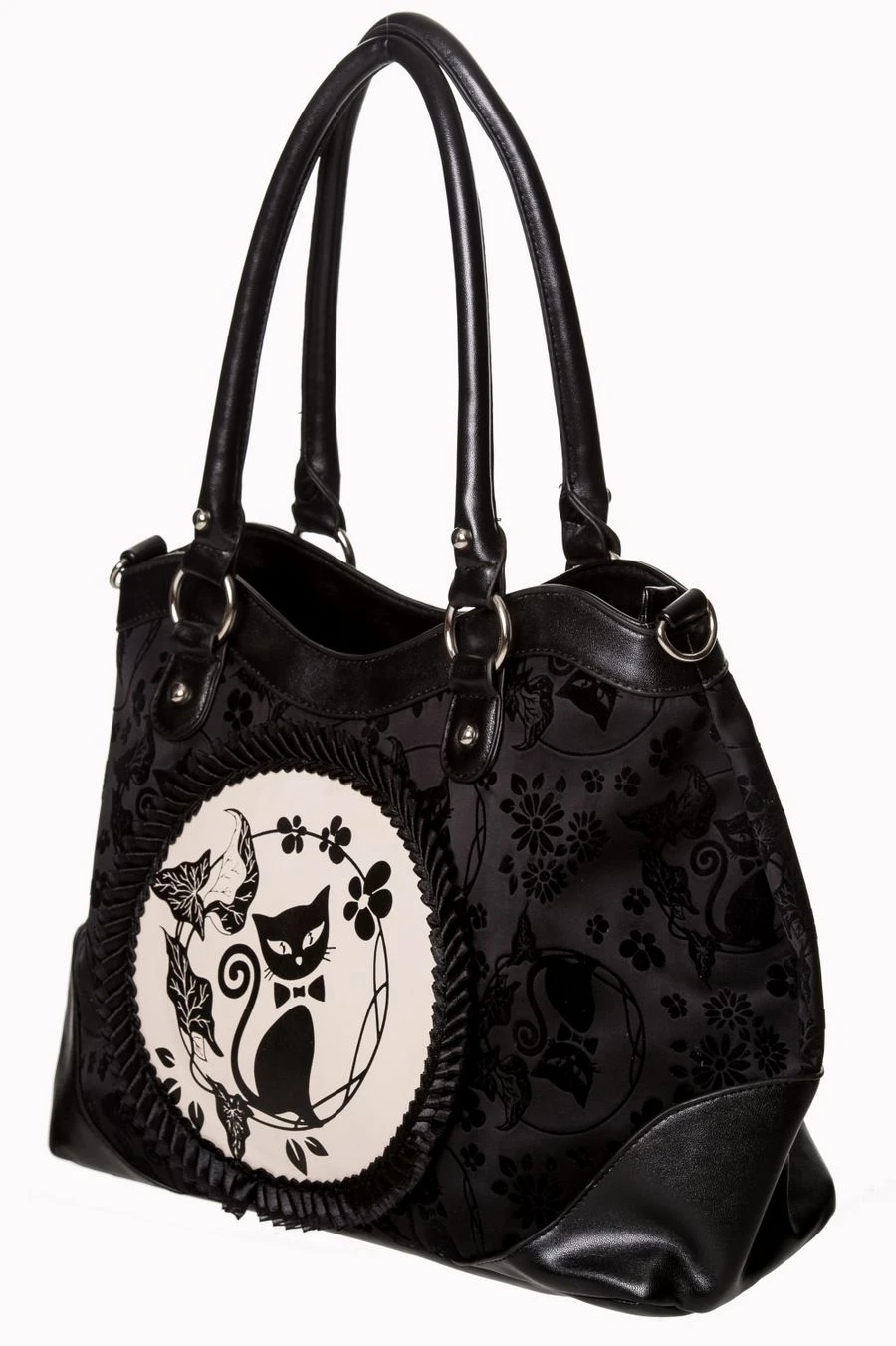 Son tissu est floqué de nombreux chats noirs en velours ton sur ton