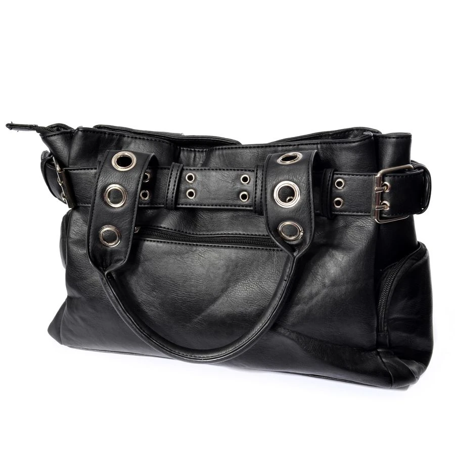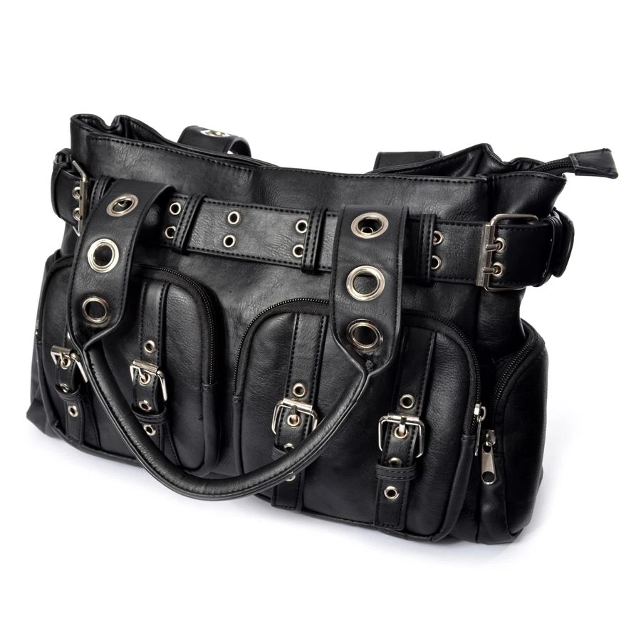 Beau sac goth en simili cuir noir, il est richement décoré de sangles et oeillets métalliques, il possède 5 poches extérieures