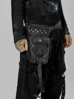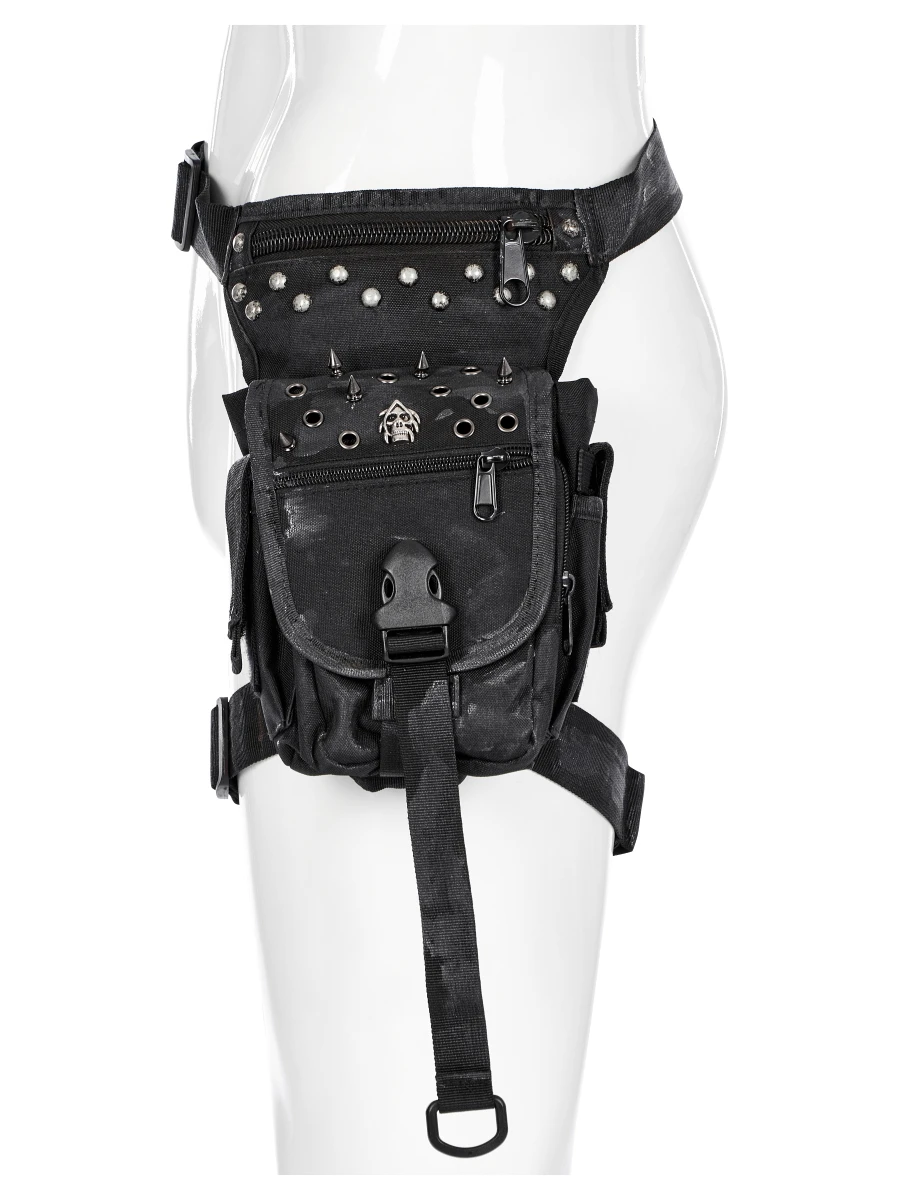 La sacoche est richement décorée de gros rivets, de clous pointus, d’oeillets et d’une tête de mort métallique