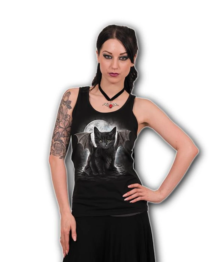 Il est agrémenté d’une sérigraphie sur la face avant représentant un chat noir avec des ailes de chauve-souris et des dents de vampire