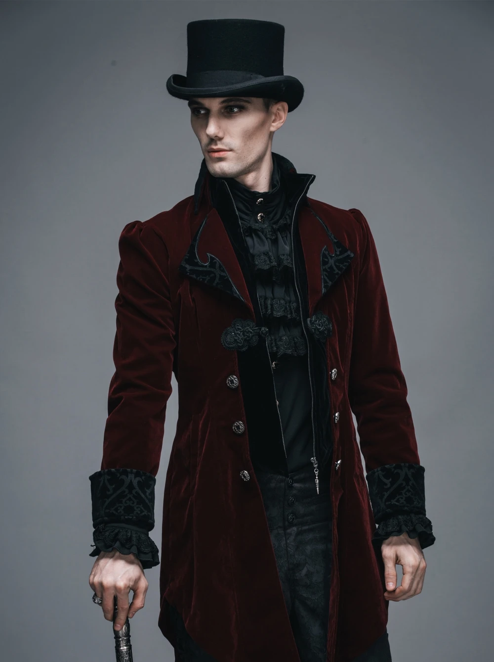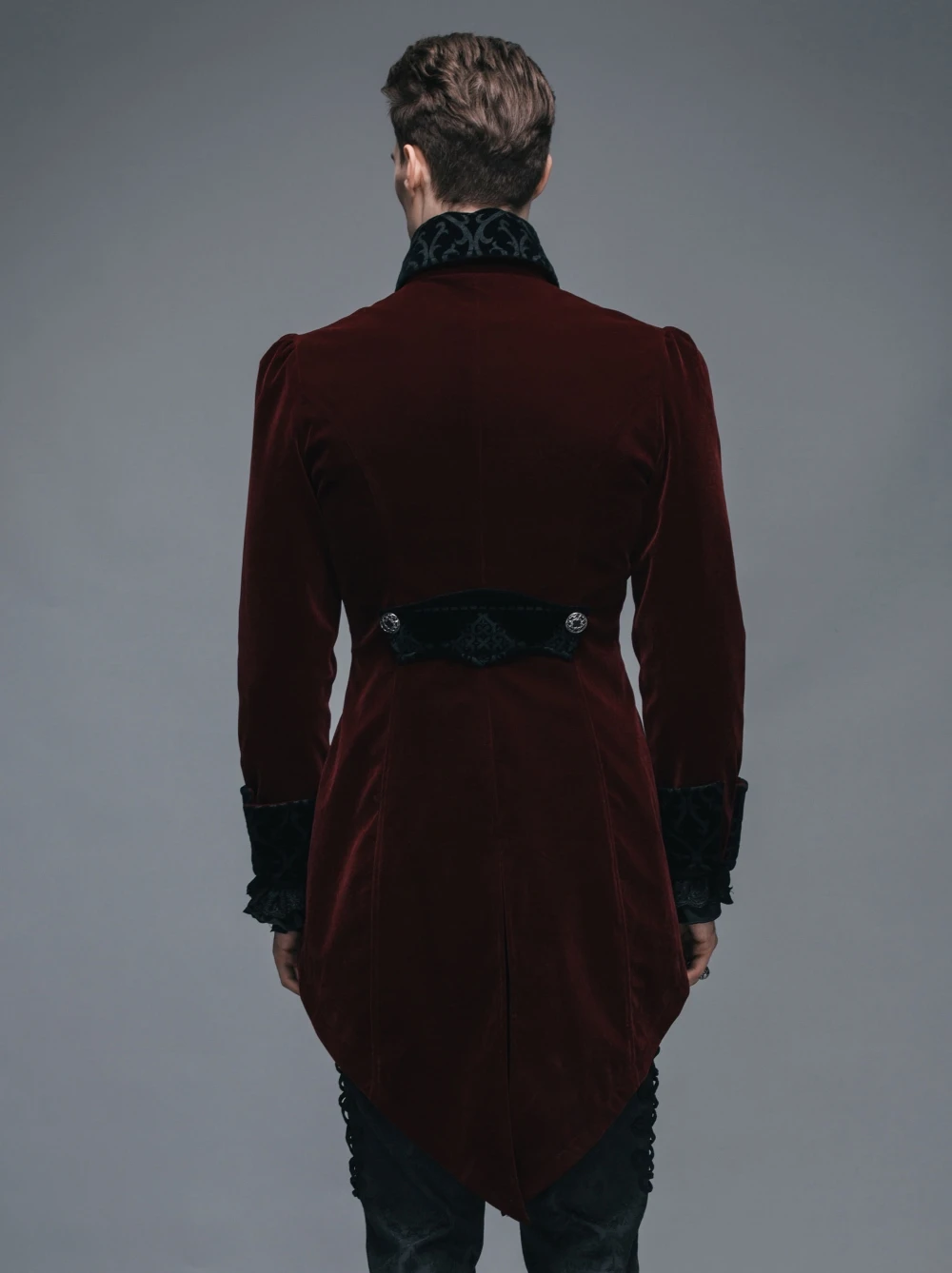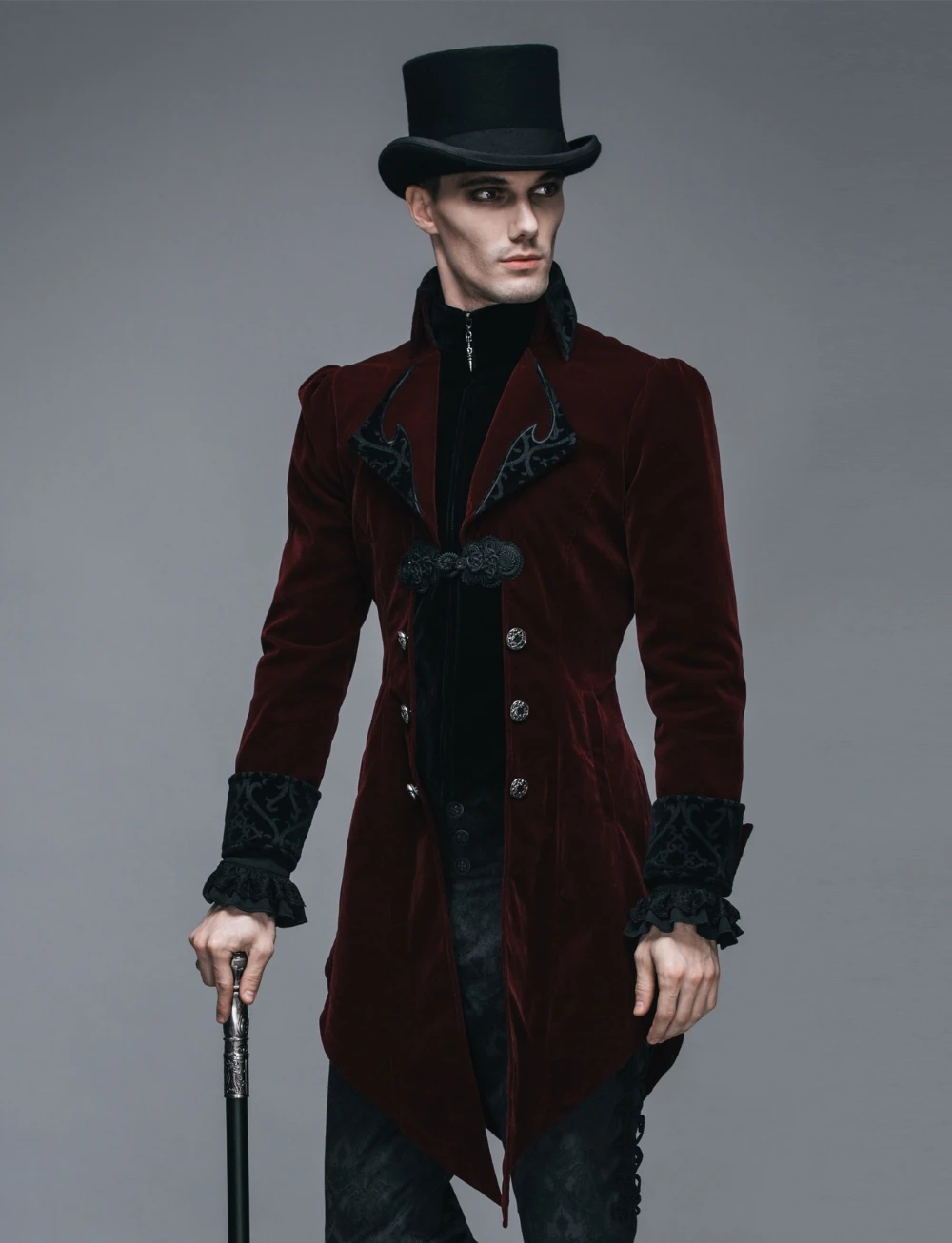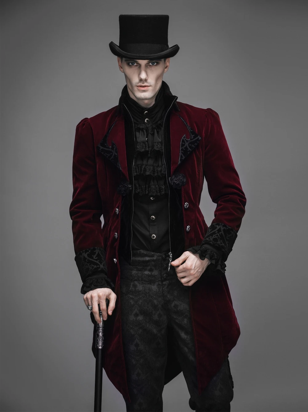 Veste gothique homme en velours bordeaux soft avec coupe en queue de pie, elle possède des motifs baroques sur les revers de manches et au col, les boutons décoratifs de style baroque ainsi que la grande broderie de fermeture lui apportent une touche XIXème de toute beauté.